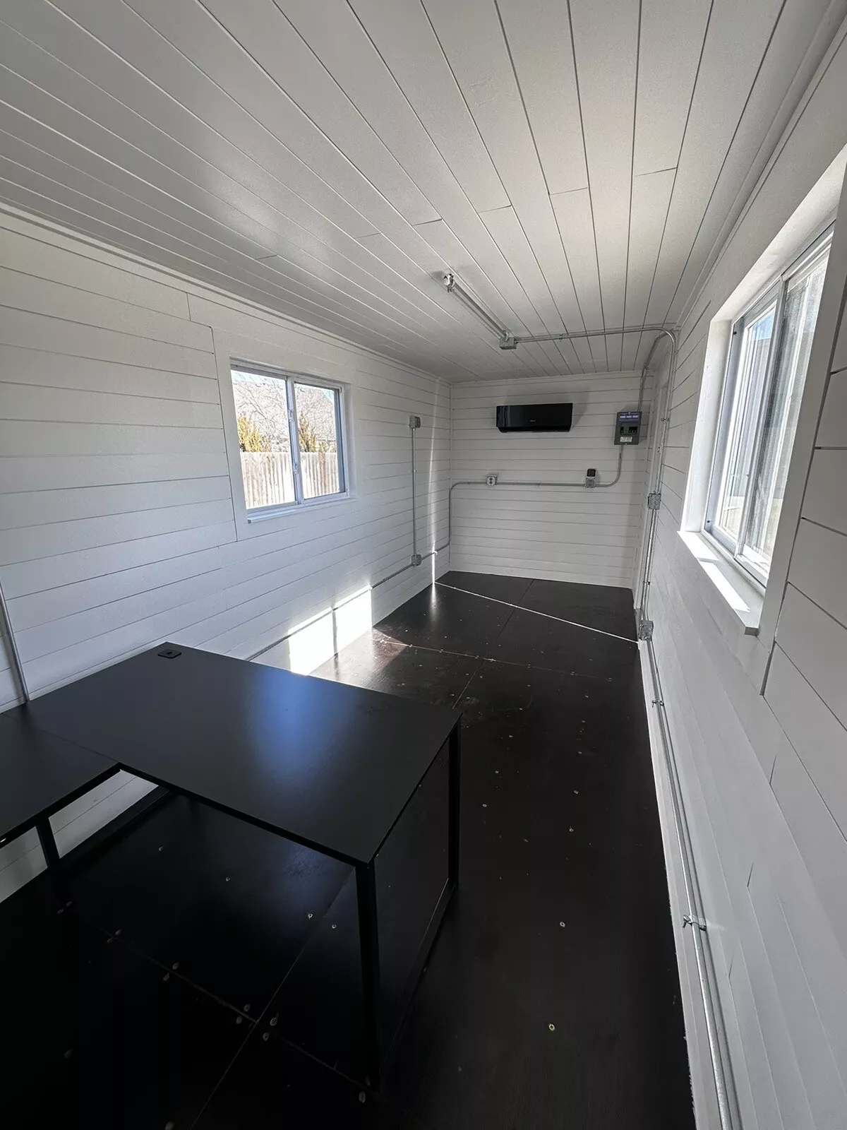 20’ slate one-trip new shipping container office. 120v (extension plug runs everything). LED lights, several plugs. 12,000 BTU minisplit heat and air. 36” walk-door with two 48”x36” windows. Shiplap interior finish with closed-cell spray foam including underneath the floor. This container is built right with all tubular frames for doors and windows.